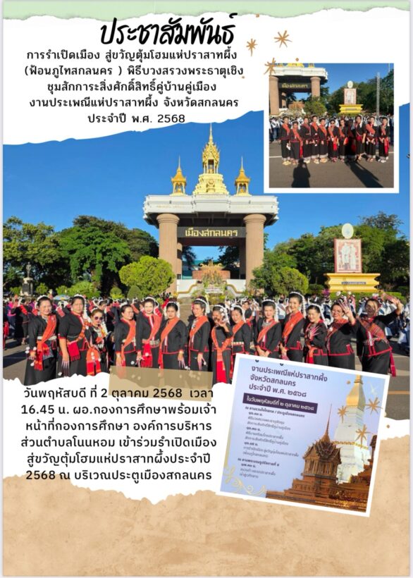 วันพฤหัสบดีที่ 2 ตุลาคม 2568 เวลา 16.45 น. ผอ.กองการศึกษาฯ พร้อมเจ้าหน้าที่กองการศึกษาฯ อบต.โนนหอม เข้าร่วมรำเปิดเมืองสู่ขวัญตุ้มโฮมแห่ปราสาทผึ้ง ประจำปี 2568 ณ บริเวณประตูเมืองสกลนครข่าวประชาสัมพันธ์ Admin จำนวนผู้เข้าชม : 5 Facebook iconFacebookTwitter iconTwitterLINE iconLine