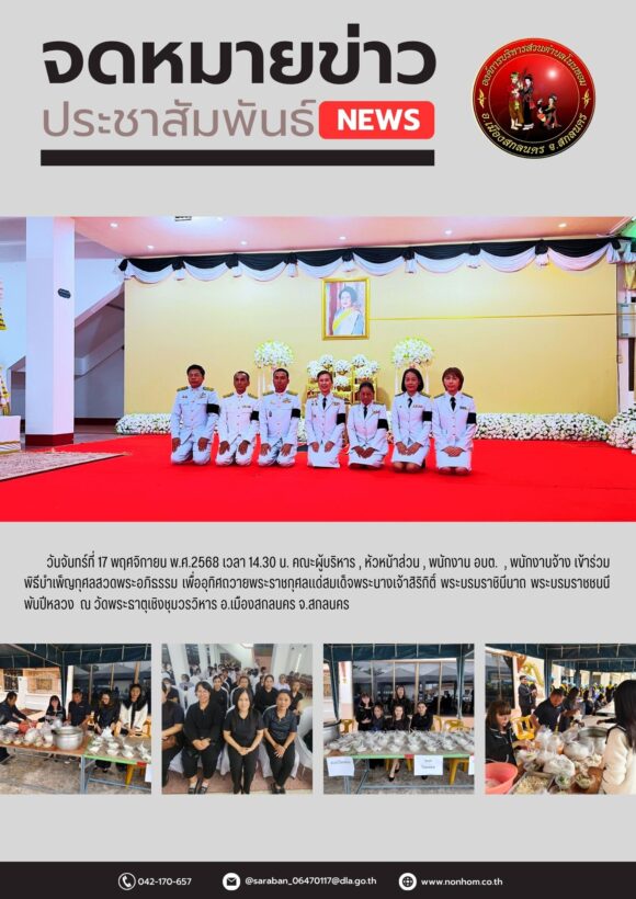 วันจันทร์ที่ 17 พฤศจิกายน พ.ศ.2568 เวลา 14.30 น. คณะผู้บริหาร , หัวหน้าส่วน , พนักงาน อบต. , พนักงานจ้าง เข้าร่วมพิธีบำเพ็ญกุศลสวดพระอภิธรรม เพื่ออุทิศถวายพระราชกุศลแด่สมเด็จพระนางเจ้าสิริกิติ์ พระบรมราชินีนาถ พระบรมราชชนนีพันปีหลวง ณ วัดพระธาตุเชิงชุมวรวิหาร อ.เมืองสกลนคร จ.สกลนครข่าวประชาสัมพันธ์ Admin จำนวนผู้เข้าชม : 3 Facebook iconFacebookTwitter iconTwitterLINE iconLine