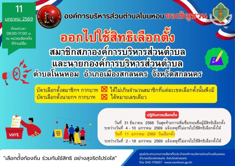 ประชาสัมพันธ์ อบต.โนนหอม ขอเชิญชวนพี่น้องชาวตำบลโนนหอม ออกไปใช้สิทธิเลือกตั้งสมาชิกสภาฯ อบต. และนายก อบต.ข่าวประชาสัมพันธ์, ประกาศ, ไฮไลท์ Admin จำนวนผู้เข้าชม : 4 Facebook iconFacebookTwitter iconTwitterLINE iconLine